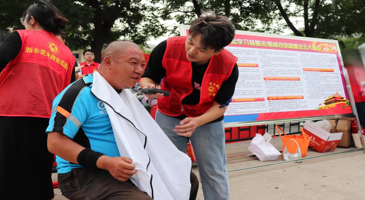 9月5日上午,新乡市民政局联合市慈善总会在新乡市人民公园东门开展了以“崇德向善 依法兴善”为主题的宣传活动。在活动现场,新乡市慈善总会联合市工商联“志愿新乡行”开展公益理发服务,安排5名志愿者免费为群众理发。